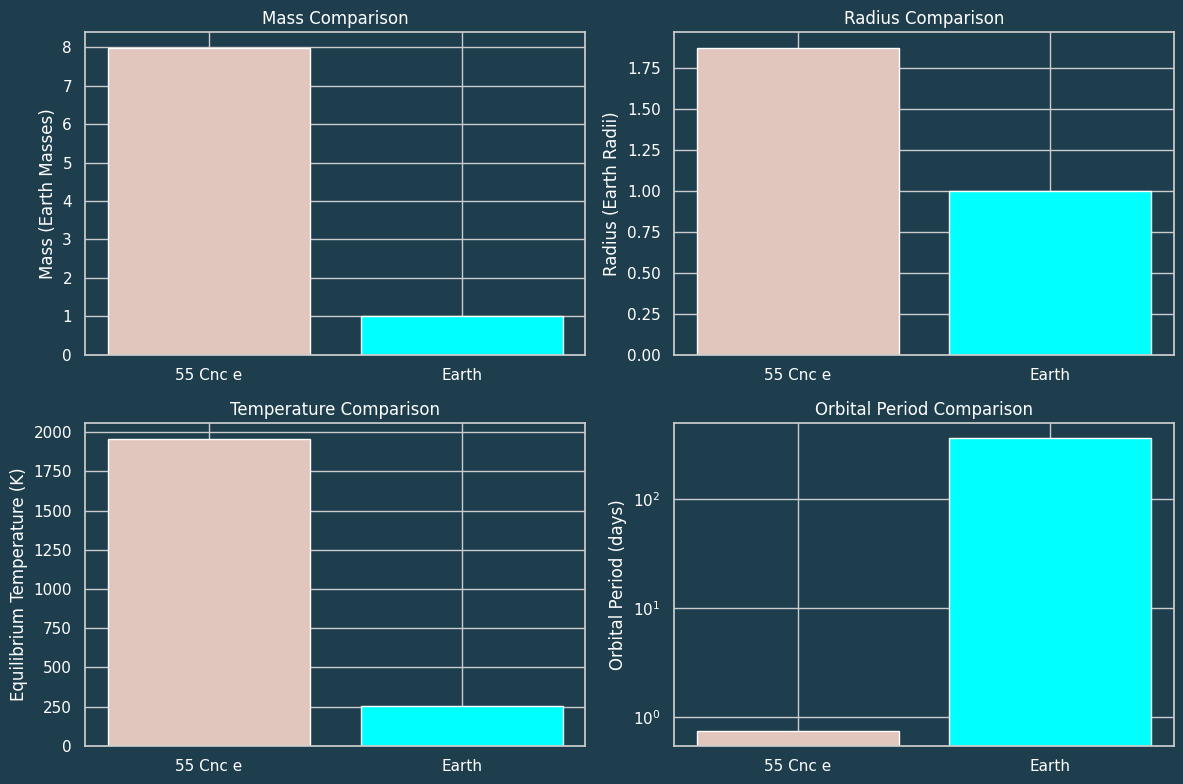 55 Cancri e is a fascinating super-Earth with extreme conditions far different from anything in our Solar System. Its size and mass place it between Earth and gas giants like Jupiter, but its extreme heat, rapid orbit, and close proximity to its star make it a unique and hostile world. The contrast between 55 Cancri e and both Earth and Jupiter highlights the diversity of exoplanets and the variety of planetary systems in the universe.