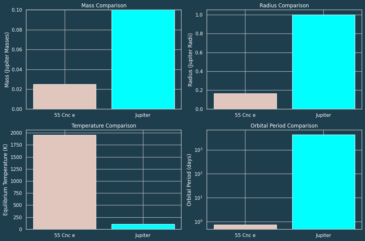Mass and Size: Jupiter has 318 Earth masses, dwarfing 55 Cancri e’s